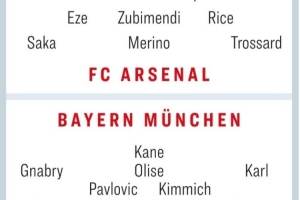 体育资讯11月24日讯 拜仁和阿森纳在本轮联赛各自取得大胜,两队也将在周中迎来欧冠榜首之争,拜仁作客挑战阿森纳。《踢球者》也预测了双方首发: